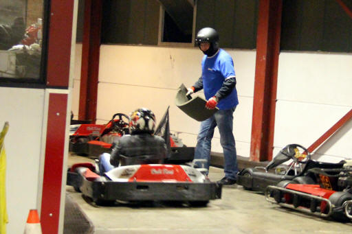 Dennis v D übergibt Jürgen H sein Kart.